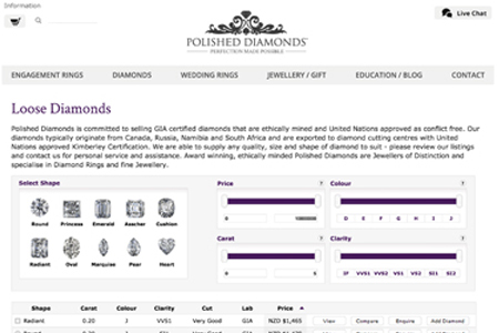 Polished Diamonds provides an interactive tool to help select your diamond and compare the vital factors of price, colour, carat and clarity. The cut quality is also an important factor in deciding which diamond would best suit you.